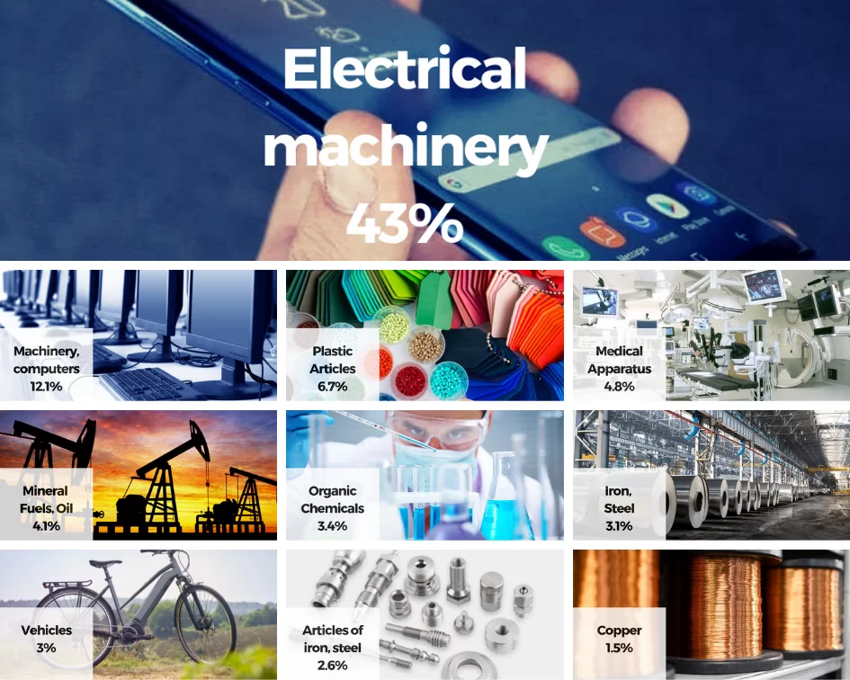 - Electrical machinery, equipment – $144.3 billion (43% of total exports)