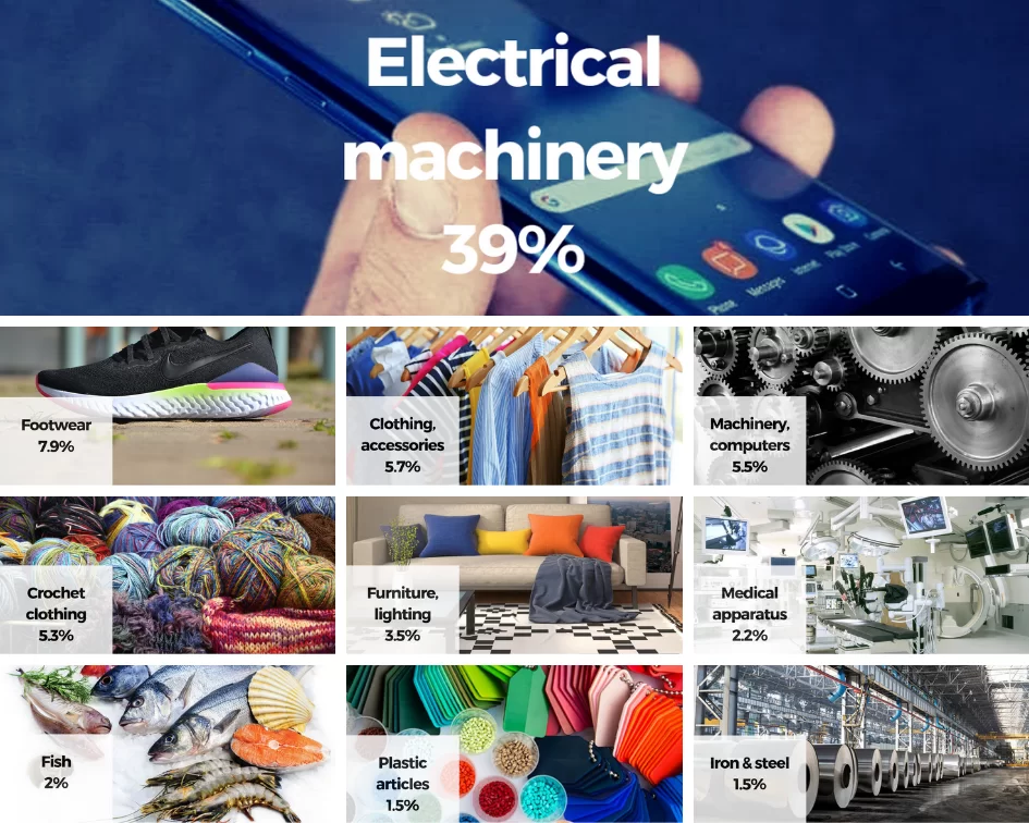 Electronic and electrical products are the country’s top exports. Vietnam has a strong competitive advantage in the market for electrical products, including smartphones, integrated circuits and micro assemblies, TV, radio or radar device parts.